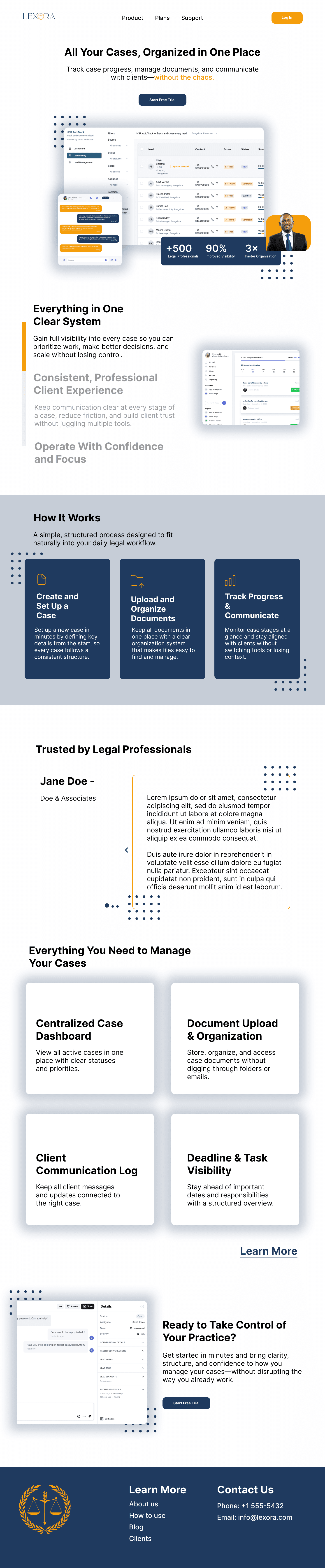Lexora needed a landing page to clearly communicate its value as a case management platform, build trust with legal professionals, and demonstrate how it simplifies case organization, document management, and client communication—while ensuring a clear structure, intuitive navigation, and a seamless, conversion-focused user experience.